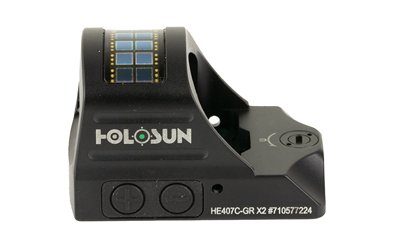The HE407C-GR is an open reflex optical sight designed for pistol applications. Features include Holosun’s Green Super LED with up to 50k hours battery life, 2MOA dot only, Solar Failsafe, and Shake Awake.